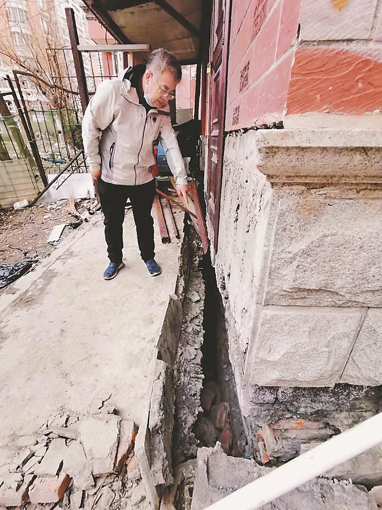 近日,哈尔滨市民廉先生代表全体小区居民向本报求助称,他居住在恒运花园小区B座高层,地面塌陷出一个面积有数十平方米的坑,有十几天了,水泥地面出现裂缝,地面散水坡与楼体之间形成10厘米多宽的裂缝。居民们找了多个相关单位和部门,问题一直没有解决。