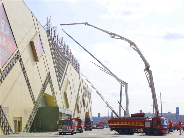 生活报讯 (记者黄迎峰文/摄) 30日下午,哈尔滨市消防救援支队在海宁皮革城有限公司开展大型综合体实战拉动演练。此次演练共计出动10个消防救援站、33台消防车100余名指战员。