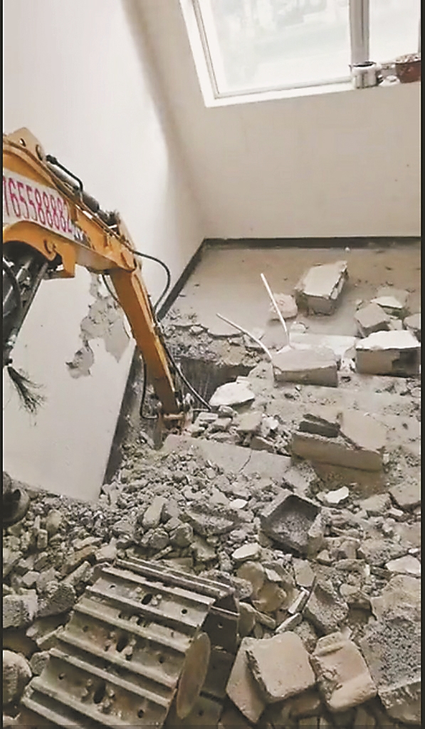 从居民提供的图片和视频可以看出,有的一楼顶板的横梁被砸断,有的露出钢筋。居民称,被砸断的横梁钢筋直径可达25毫米,应该是承重梁。有些人家为了拆改方便,直接把钩机开上了二楼,用大型机械打通楼板。