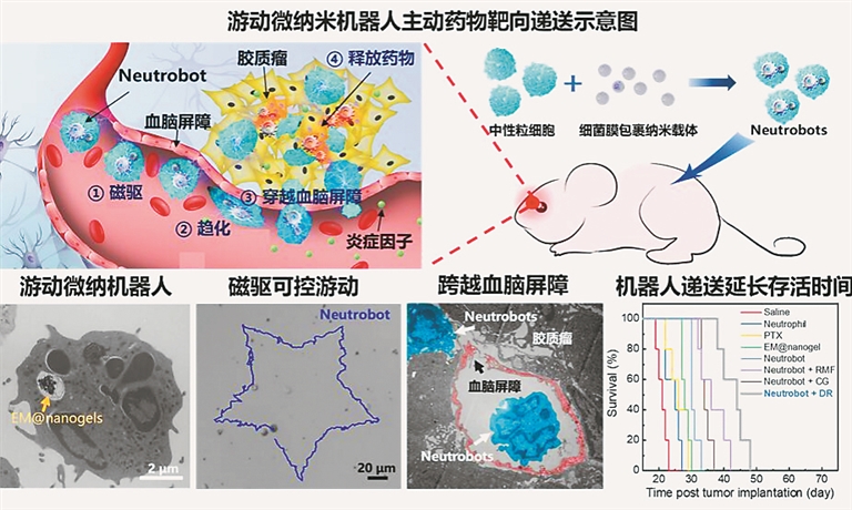 据了解,游动微纳米机器人(Neutrobot)通过中性粒细胞吞噬大肠杆菌膜包裹的磁性载药水凝胶制备而成。该游动微纳米机器人可有效且稳定地携带紫杉醇等抗癌药物,依靠自主研发的控制系统将游动微纳米机器人引导到脑部区域,抵达脑胶质瘤区域的机器人可自主感知病原信号并穿越血脑屏障后游动到病患位点,将药物精准地释放到病患处,显著提高了药物的靶向效率。