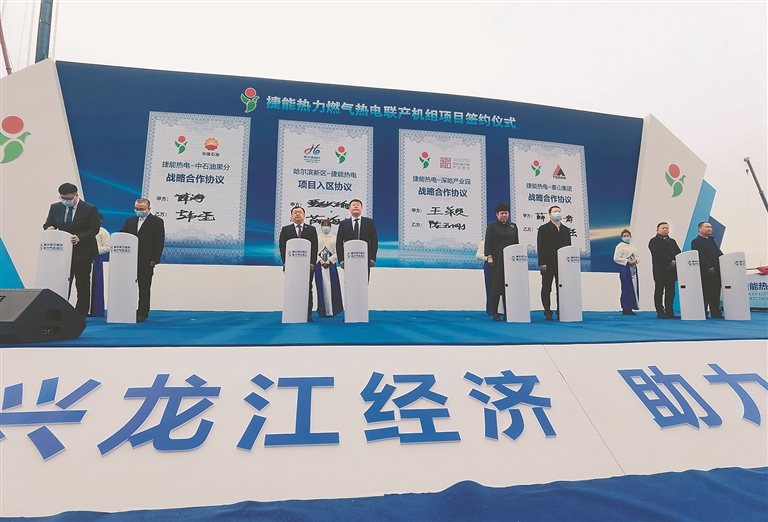 生活报3月31日讯 (实习生郝天朔 记者黄迎峰文/摄) 3月31日上午,捷能热力电站有限公司在哈尔滨新区举行燃气热电联产机组项目签约暨启动仪式。据悉,该项目是哈尔滨新区首个推进的“气化龙江”战略重点项目,也是我省首例大型引用俄气供暖的工程,拟纳入今年的省百大项目。