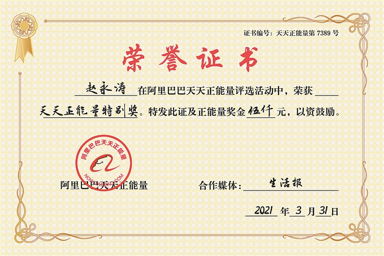 31日下午,阿里巴巴天天正能量的工作人员联系本报记者表示,天天正能量将联合生活报为赵永涛颁发正能量特别奖及5000元奖励。