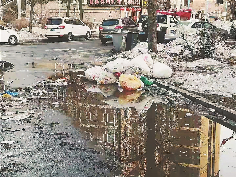 在银河小区记者看到,小区道路两侧绿化带内尽是生活垃圾、建筑垃圾和未清理干净的冰雪。道路凹凸不平存有积水,还有随处可见的动物粪便。一名67岁的老大爷告诉记者,前段时间广场上的雪没人清理,后来实在没办法,他联系了两个老朋友,3个人拿着扫帚、铁锹清理出了一片空地。