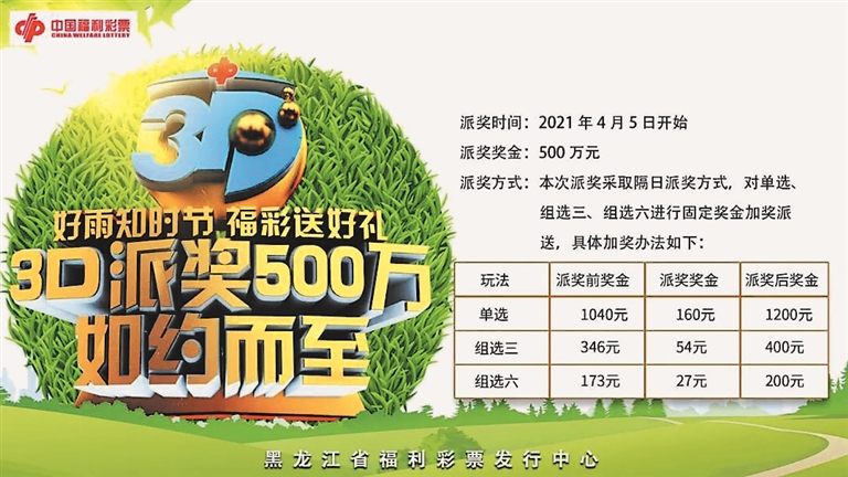 生活报讯 (记者李丹) 春天到,福运到,龙江福彩送欢笑!为回馈广大彩民一直以来对“3D”游戏的支持和对龙江福利事业的爱心奉献,自4月5日起,龙江福彩将在全省开展“3D”游戏派奖活动,派奖奖金总额500万元。