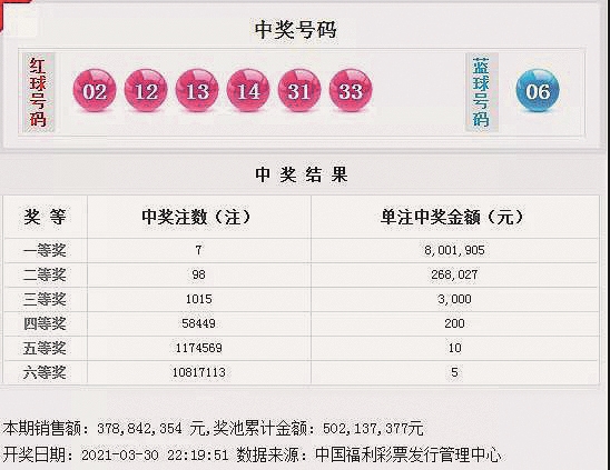 3月30日晚,中国福利彩票双色球游戏进行第2021033期开奖。当期双色球红球号码为02、12、13、14、31、33,蓝球号码为06。
