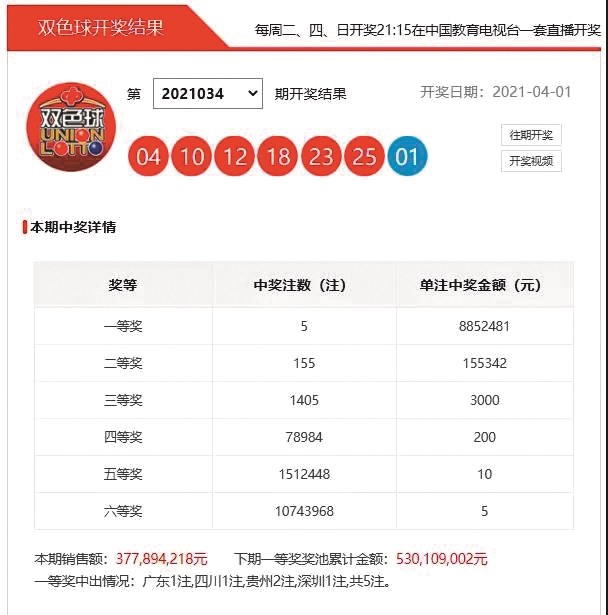 4月1日晚,中国福利彩票双色球游戏进行第2021034期开奖。本期双色球红球号码为04、10、12、18、23、25,蓝球号码为01。