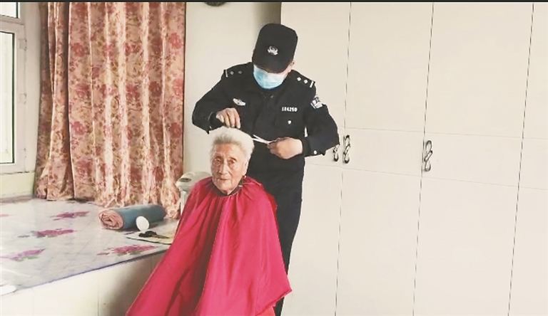当日,鸡西边境管理支队民警张宝亮在辖区入户走访中认识了赵奶奶,这位老人生于1921年,现在正好100周岁。赵奶奶行走不便,平时理发很难。张宝亮入伍前曾经营了一家理发店,剪发是他的“老本行”,于是主动帮助赵奶奶修剪了头发。
