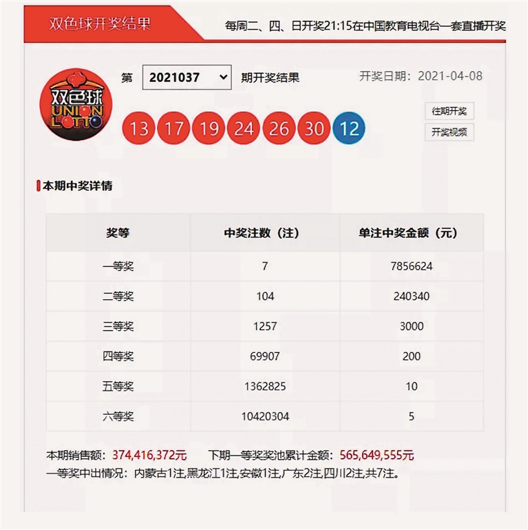 4月8日晚,中国福利彩票双色球游戏第2021037期开奖。本期双色球红球号码为13、17、19、24、26、30,蓝球号码为12。