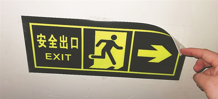 在圣约翰区2栋1单元、2单元走访时,也发现多个楼道内的安全出口指示灯要么不亮,要么就是用不干胶贴上去的。小区内,物业工作人员车内存放着安全出口不干胶贴。这位工作人员表示,指示灯经常连电打火不安全,坏了就把灯摘下来,用这个不干胶贴上。11日晚,居民反馈,这个不干胶贴不是夜光的,晚上不亮。
