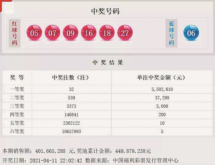 4月11日晚,中国福利彩票双色球游戏进行第2021038期开奖。当期双色球红球号码为05、07、09、16、18、27,蓝球号码为06。