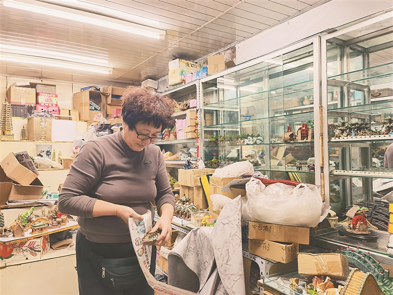 在一家卖鱼缸盆栽饰品的店铺里,一戴眼镜的大姐正在有条不紊地用报纸将装饰宝塔一个个卷起装箱。打包期间,还不时有“捡漏”的市民前来淘宝。