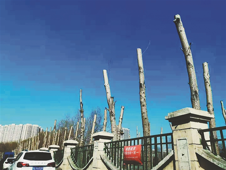 生活报讯 (记者张立 仲亮文/摄) “好端端的大树成了‘秃头’,还能活了吗?”“原来的树冠特别大,现在修剪的就成一根棍了。”……日前,哈尔滨市南岗区鸿朗花园几位居民发现,家门口西河沟一侧去年开春还枝繁叶茂的70多棵大树,过了一冬竟惨遭“抹头”。如今只留下一棵棵光秃秃的树干,既破坏景观又影响树木的正常生长。按照市民的投诉,13日,记者来到现场进行采访。
