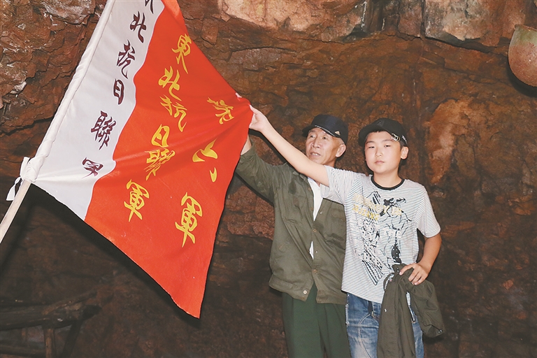下图张宝庆和孙子张烙名在“中共北满省委旧址”岩洞中 刘斌 摄