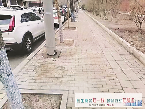 生活报讯 (记者李丹文/摄) 近日,由哈市城管局、生活报联合推出的“民生服务在一线 城管行动在身边”行动热线接到市民王先生的来电,“衡山路31号门前,路灯杆下的步道板损坏,希望相关部门能尽快处理一下。”