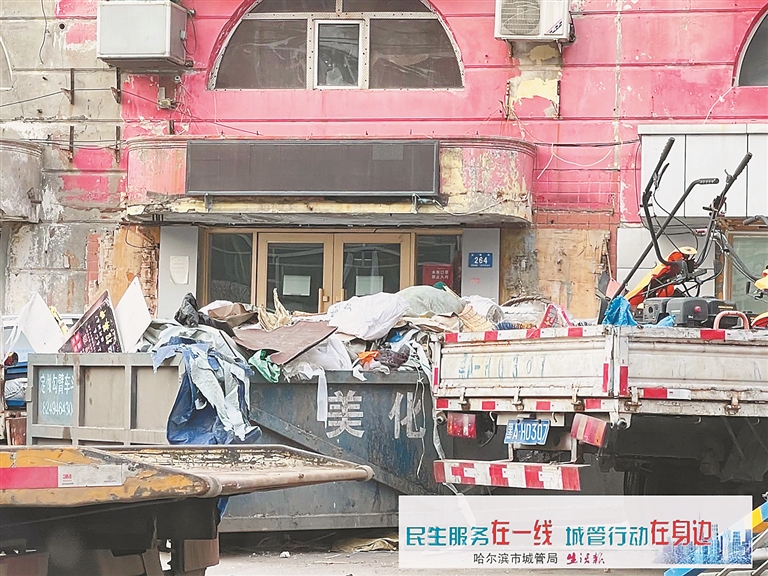 生活报讯 (记者李丹文/摄) 20日,“民生服务在一线 城管行动在身边”行动热线接到市民方先生来电,铁路街264号门前堆放了垃圾。近日,随着哈尔滨室外温度的攀升,出现了异味,希望相关部门能尽快处理一下。