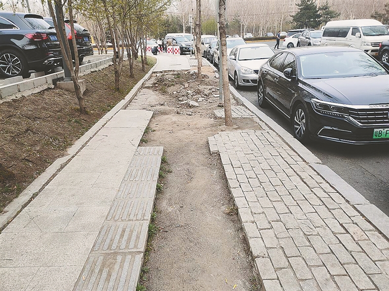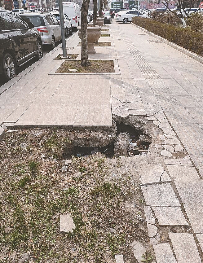 当日,记者来到群力第四大道看到,在群力第四大道与金江路交口附近,第四大道北侧的人行道上有很大面积的步道板缺失,地上还有土堆,从这里经过很不方便。顺着第四大道向西走,人行道上还有几处路面出现破损,还有一处塌陷出一个大坑。坑里已经积攒了一些生活垃圾,看起来已经破损很长时间。在附近工作的张先生说:“路面坏了有一段时间了,我天天从这儿走,有时候确实不太方便,一不小心就会踩坑里。”