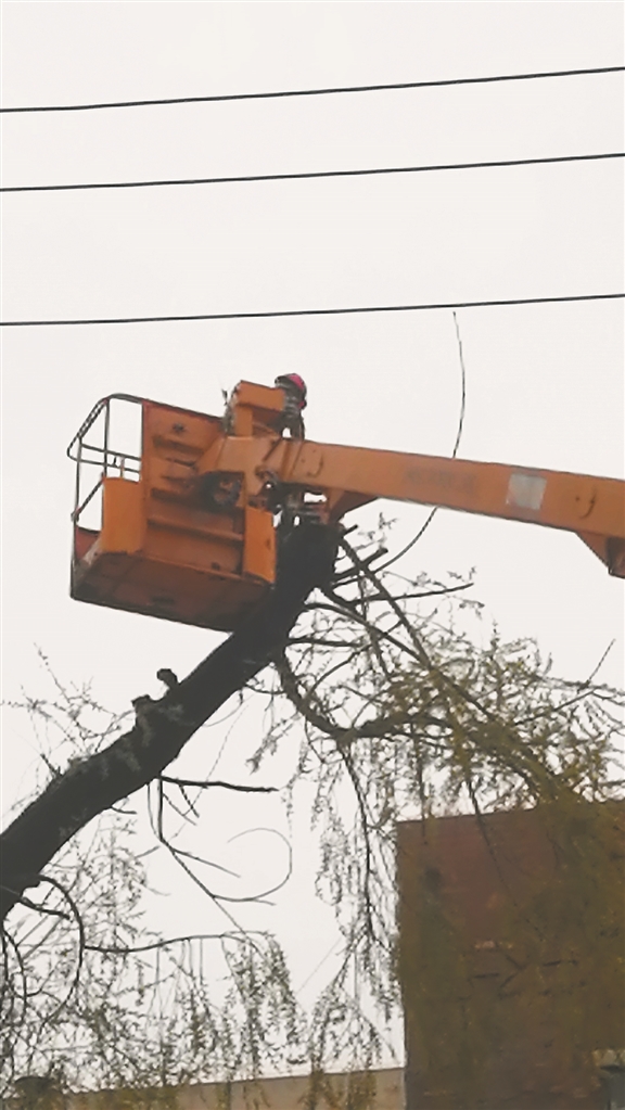 经查,树干上方有电线,树下紧靠居民住宅。道外区园林局当即与道外区供电局联系,协调有关人员采取停电措施,确保行人和车辆出行安全的前提下,组织专业队伍、设备进行伐除处理。