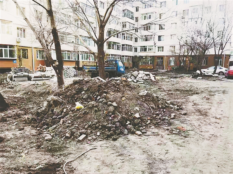 当日,记者来到现场,在301栋附近看到,地面没硬化,也没铺步道板,地面上裸露着尘土,一阵风吹来尘土飞扬。一个高约一米的土堆堆放在树根旁,土堆上有破砖头瓦块,在土堆旁,停着一辆铲车一辆钩机。居民石先生表示,土堆和停放钩机的位置,原来是绿地,去年,进行了老旧小区改造,施工队进入后开始施工,把庭院内的绿地、路面都挖开。当时听说工程结束后重新铺路,可小区改造基本结束了,地面还没重新铺装,居民们为出行方便,多次找过小区物业公司,但是,一直没解决。