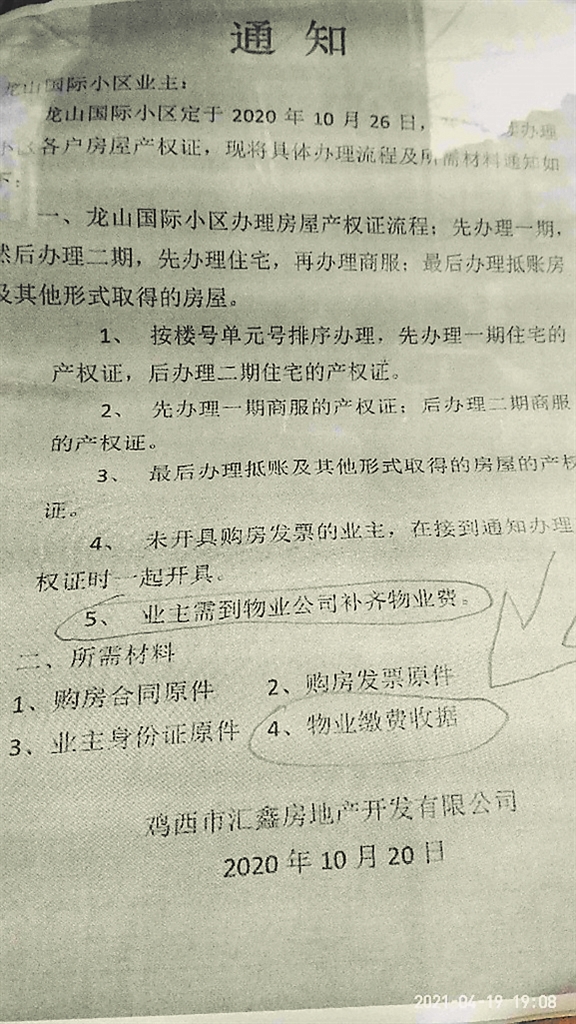 据介绍,龙山国际是由鸡西市汇鑫房地产公司负责开发建设的。居民们提供的该公司于去年10月20日张贴的办证通知上显示,办证流程第5条是业主需到物业公司补齐物业费,办证所需材料中还包括物业缴费收据。