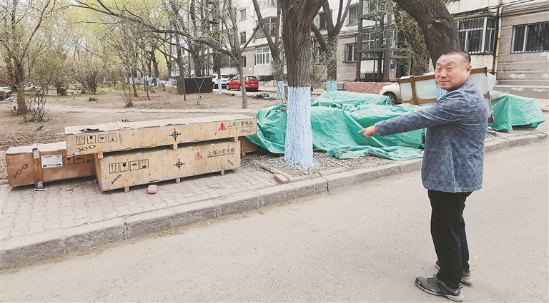 在楼前和过道旁空地上堆放着很多箱子,有的用苫布遮盖着,有的苫布已经破烂不堪,还有没遮盖的箱子外表文字和标识已经有些模糊。居民说,这就是电梯配件,就这么露天堆放,风吹雨淋,有的零件已经锈蚀,丢了也没人管。