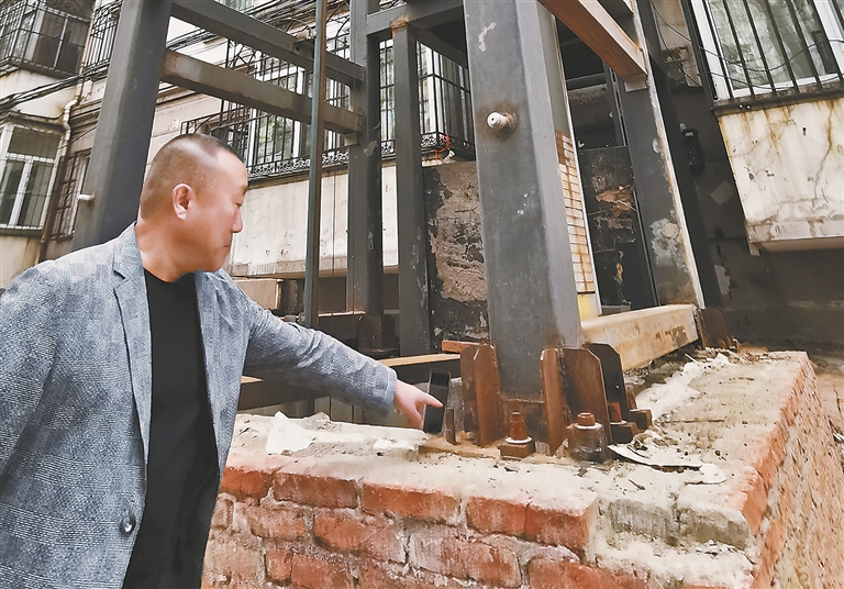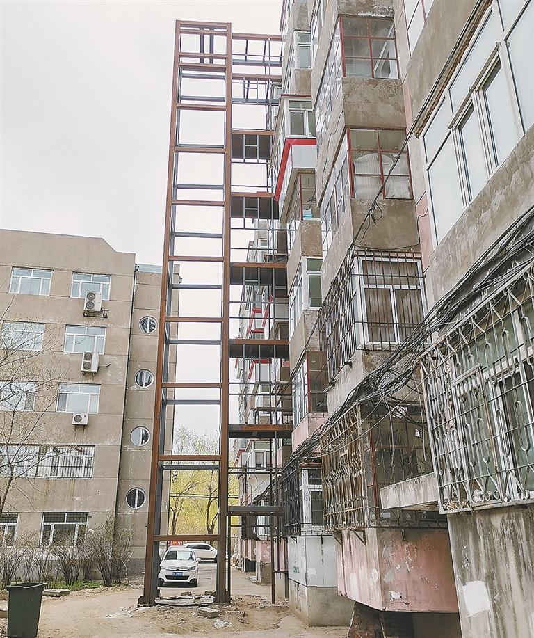4月28日上午,记者来到位于南岗区海河路的建工小区。一进门就看到,有几栋多层居民楼单元门前已经建成了室外电梯大框架,这些钢结构框架的底座已经锈蚀。从楼前地面到单元门外,原本的地面被破坏,用砖砌成的电梯基座用一些破木板等杂物挡着,防止人掉入框架井。