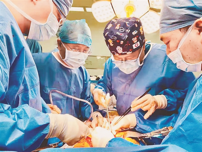手术当日,心外科王柏春主任及樊占威主治医师为患者行开胸手术,并游离出右侧股动静脉,切开心包后,见癌栓已达右心房边缘,于右心房下预留置血管阻断带;后由肿瘤肝胆外科徐力善主任做腹部切口,充分游离肝脏,将肝脏翻起,显露肝后下腔静脉,并于下腔静脉远端及门静脉预留置血管阻断带。随后由王晓民操刀,离断左肾动脉,完整游离左肾,仅留左肾静脉。此时,分别阻断下腔静脉远端、右肾静脉、门静脉及心包内下腔静脉近端,剖开下腔静脉,将癌栓及左肾完整切除。术中阻断血管约7分钟,出血量仅300毫升。