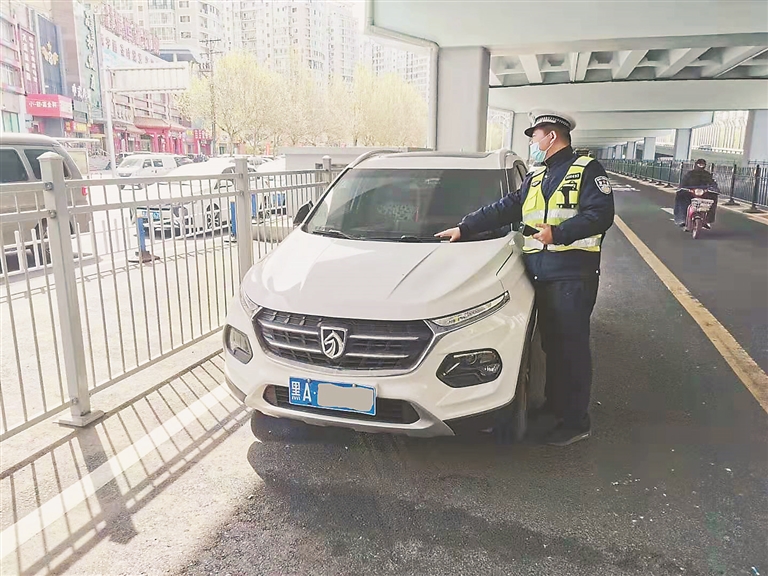 南岗交警贴条违停车辆 由哈市南岗交警提供