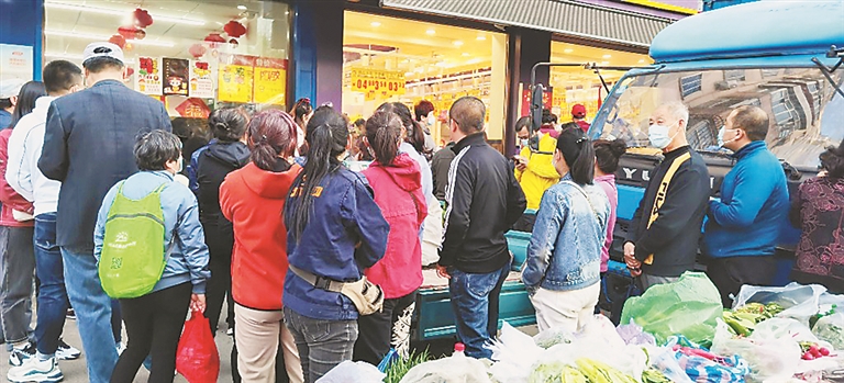 网传的视频显示:天刚蒙蒙亮,一家生鲜店前就排起了长队。另一家肉铺门前,同样也排着长队,一男子扛着半个猪肉柈子往店里走。
