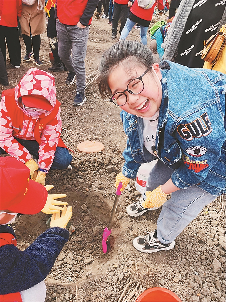 星期六上午,我作为小记者参加了公益春植活动。到了植树现场,我们三个小伙伴分好工后就积极行动起来。首先,我用铁锹铲出一个小坑,这里的土结成了块,挖起来便有点儿费劲,可这难不倒我们,没过多久, 树坑就被我们挖好了。然后,我把小树放进坑里扶直,果果和小胖把土填进坑里埋土,并用铁锹把土拍平,小树苗的根深深地扎进泥土里了。最后,我拎着水桶去水车边接了满满一桶水,笨手笨脚的样子像一只企鹅,逗得大家哈哈大笑。浇完了水,看着我和小伙伴们亲手栽种的小树,我仿佛看到在未来,小树长成一片郁郁葱葱的树林。