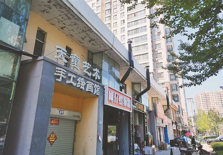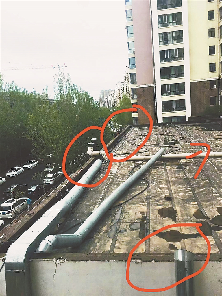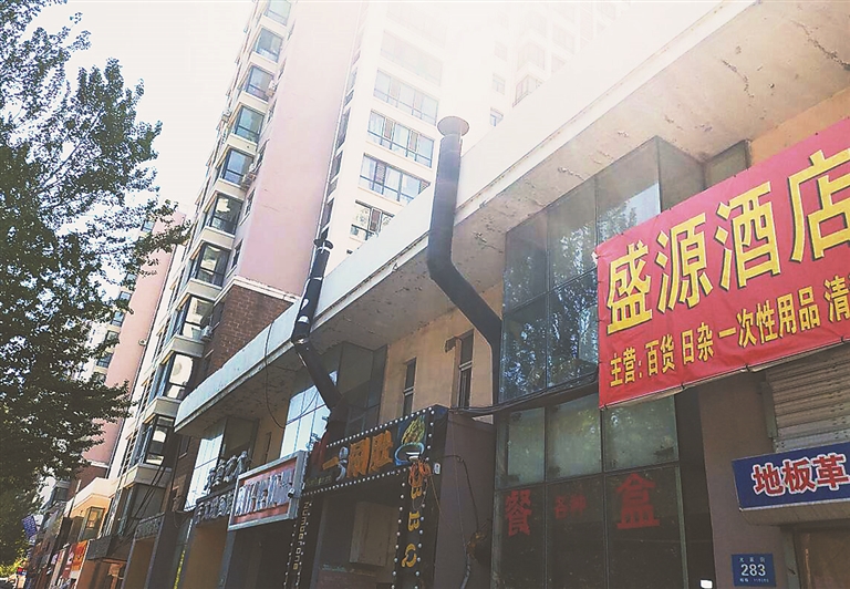 家住西典家园C3栋的王女士告诉记者,她住在3楼,在C3栋和C2栋之间有一个二层楼,楼下开了好几家饭店,这几家饭店全都把排烟管安装在了房顶上,因排烟管距她家窗户太近,加上近期风比较大,只要一开窗,油烟就被吹进屋里。最近一段时间,有一根排烟管断了,排烟口正好就在自家窗前,油烟味更大了。王女士说:“一个房顶上有四五个排烟管,排烟口的高度正好就在我家窗户这儿。现在天热了,但我根本不敢开窗,只要打开窗户,油烟就往屋里灌,整得满屋都是油烟味。这些饭店天天营业到半夜,这谁受得了?”