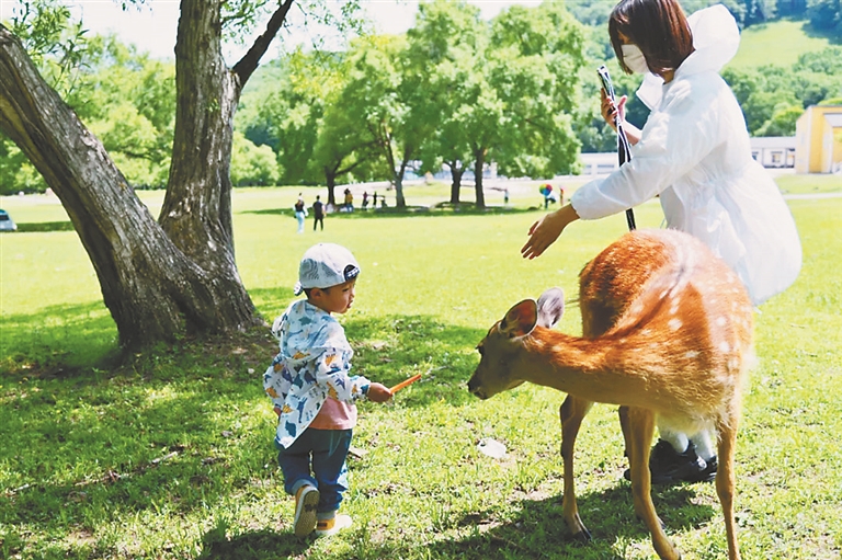 森工平山皇家鹿苑景区,游客与小鹿亲密互动