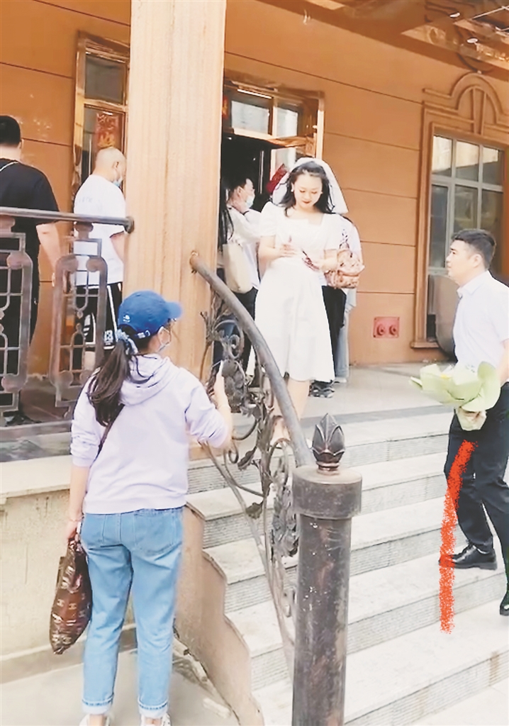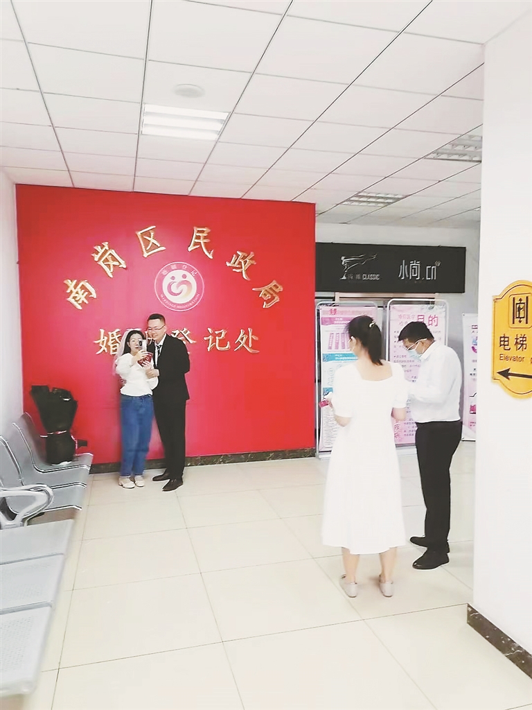 上午9点左右,记者在南岗区民政局婚姻登记处看到,等候领证的新人已经排到门外的台阶上,有的新人在拍照留念,有的手捧鲜花互送祝福,有的跟亲人连线分享喜悦。