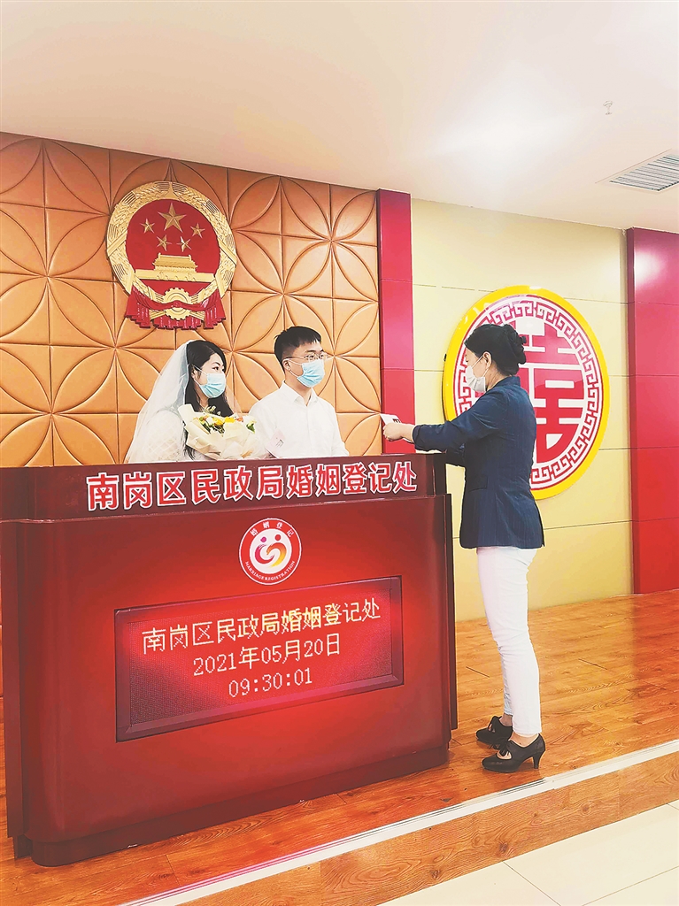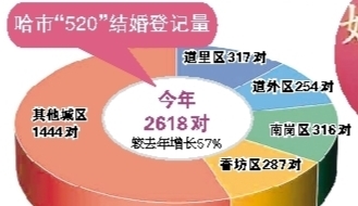 据了解,从5月6日起,哈尔滨9个城区婚姻登记机关开始接受准新人们“520”登记预约。同时启动应急工作预案,根据预约登记的工作量及时调整工作人员,调试相关设备,以保证当天婚姻登记工作顺利进行。“520”当天,全市婚姻登记员提前上班、延时下班、取消午休,全天候为新人们提供服务。