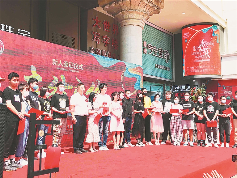 当天,南岗区民政局还为52对新人举行集体颁证仪式。在鲜花、气球衬托的大舞台上,52对提前预约领证的新人依次走上前,从“特邀颁证师”手中领得自己的结婚证。这些“颁证师”主要是各行各业的杰出模范人物,他们将鼓励和祝福送给新人们,希望他们能开启人生的新篇章。