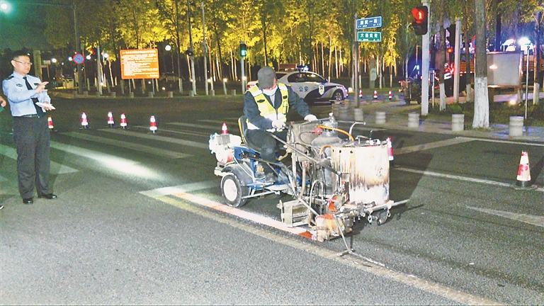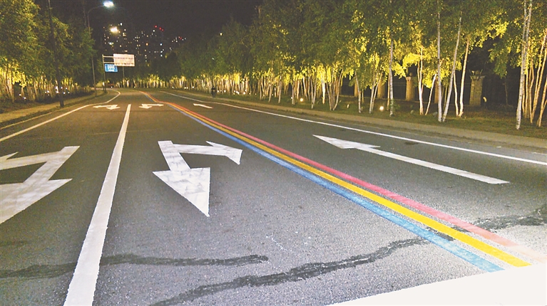 20日夜间,在松北区大剧院街与剧院二路交口附近,交警与施工人员正在施划新的交通标线,这种由红、黄、蓝三种颜色组成的“彩虹标线”,让整条车道更显美观。“彩虹标线”一经推出后,立即成为哈市的又一个网红打卡地,路过的群众纷纷驻足观赏、点赞。“这是第一次见到,设计很时尚,简洁又好看,夜间看着也非常醒目。”驾车路过这里的市民胡某兴奋地说道。