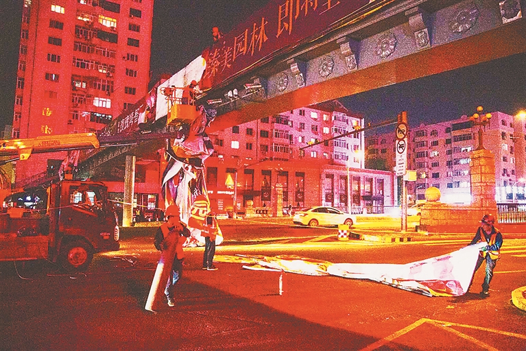 生活报讯 (记者李丹文/摄) 20日夜间,哈市城管局组织相关执法部门对安发桥与抚顺街交口过街天桥上的桥体广告进行了拆除。共拆除200余平方米。
