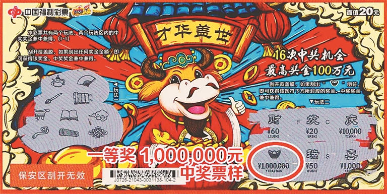 刘先生是福彩的铁杆粉丝,虽然各种玩法都有过尝试,但最青睐的一直是更简单的刮刮乐,一有时间便会买上几张试试运气。中奖当天,他先是买了两张20元面值的刮刮乐“才华盖世”彩票,都没中奖;意犹未尽的他又买了两张,仍旧空手而归;还是有点不甘心,便又掏钱买了两张,先刮开一张仍是一无所获。刘先生回忆说,当时他已经对手中最后这一张未刮开的彩票也不抱期待了,却不料峰回路转,当最后一张彩票兑奖区的覆盖膜被慢慢刮开,下方的“元宝”和“1000000元”渐渐浮现眼前,按照游戏规则:如刮出“元宝”图符,即获得该图符下方所对应的金额。