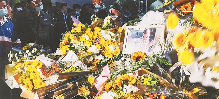 明阳山殡仪馆在入口处准备了摆台,供市民悼念。市民拿着鲜花自发排队悼念,截至23时许,桌子上的鲜花已经摆得满满如小山。工作人员不得不增加桌子。