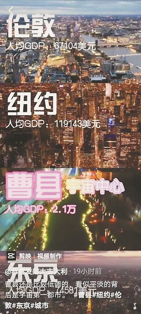 “北上广曹”;“宁要曹县一张床,不要北京一套房”;“世人皆知地球分为南半球和曹半球”;“中国看上海,美国看纽约,世界看曹县”;甚至曹县都已经取代了铁岭,成了“宇宙中心”,我们都要看看自己住在“曹几环”。