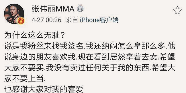 上个月,前UFC世界冠军张伟丽就陷入了一场关于“签名买卖”的风波:有网友指责张伟丽不好好训练,却靠售卖自己的签名获利,一张签名的售价高达2000多元。