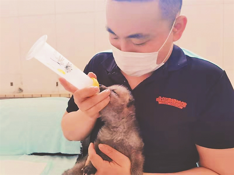 据工作人员介绍,5月上旬,哈尔滨极地公园北极狼家族新生多只北极狼宝宝,驯养师通过监控24小时观察北极狼妈妈和宝宝的情况。3天后,意外情况发生,一只狼妈妈突然弃养幼崽,北极狼宝宝生命垂危。危急时刻,驯养师决定立即启动全人工饲养方案。