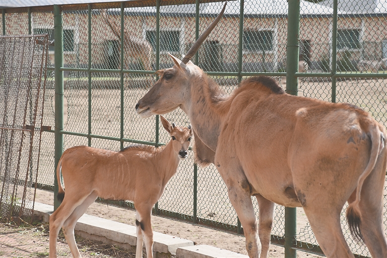 4月份,在非洲草食动物散放区新出生的雄性小大羚羊,因为胆小的大羚羊妈妈不会照料孩子,所以不给娃吃奶。饲养员便采取人工辅助的办法喂小大羚羊。虽然妈妈一直躲着自己,但小大羚羊坚持要“亲力亲为”吃奶。饲养员就拿食物在前面引诱大羚羊妈妈,让她站立安稳点,时间长一点,小大羚羊慢慢靠近就可以吃到母乳啦!
