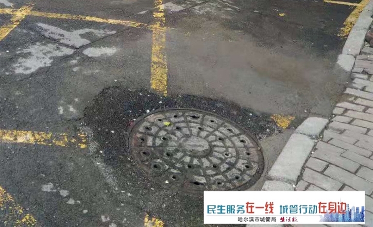 生活报讯 (记者李丹文/摄)21日,由哈市城管局、生活报联合推出的“民生服务在一线 城管行动在身边”行动热线接到市民刘女士电话称,道里区地段街104号门前的下水井盖有破损,需要修复,希望有关部门及时处理。