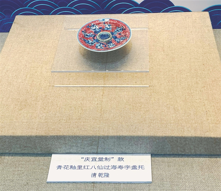 生活报讯(记者 王雪莹)清乾隆年间文物,又有一件亮相省博物馆了!记者获悉,“庆宜堂制”款青花釉里红八仙过海寿字盏托,目前正在省博阳光大厅展出。该盏托圆盘式、敞口、浅弧腹、圈足。盏托内底、白色凸起的托口内是青花团寿,外壁白釉底上均绘五只青花蝙蝠。圈足施白釉,中间青花双方框内书“庆宜堂制”双行四字楷书款。