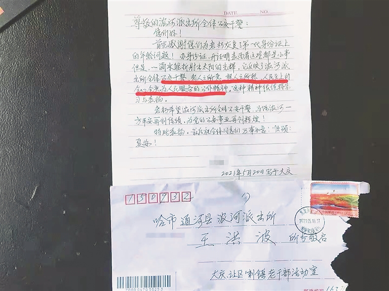 5月20日,这位老人在大庆市给以王宏波、安子月为代表的浓河所全体干警写了一封感谢信:“办身份证、开证明,表明上都是小事,但是一滴水能折射出太阳的光辉,它反映出浓河派出所全体民警急人之所急、人民至上的全心全意为人民服务的公仆精神,这种精神值得学习和表扬。老朽希望浓河派出所全体公安干警,为保浓河一方平安再创佳绩,为党的公安事业再创辉煌!”