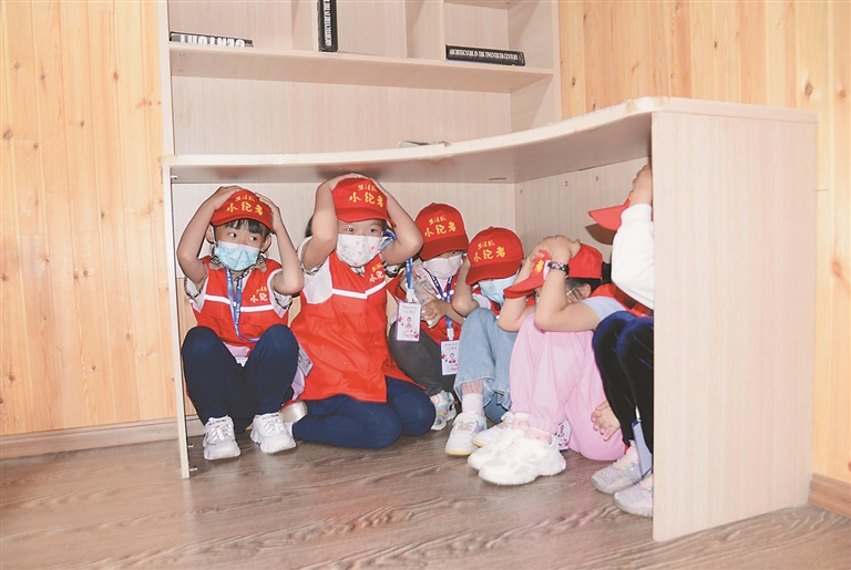 接下来是体验地震模拟小屋的环节,小记者们感到非常新奇,这个布置简单的小房间能够模拟哈尔滨市6.5-7.5级地震的状况。进入小屋之前,讲解员先介绍了一些基本的自救互救知识。带着紧张的心情,小记者们走进地震小屋,在墙角、桌子底下等地点躲好,并按照讲解员的指导,用抱枕等道具保护住关键部位。随后,一阵阵剧烈的晃动袭来,小记者们被惊吓得尖叫起来。“虽然知道不是真的地震,但房子晃起来的时候我还是有点害怕。经过模拟体验,我知道了如果遇到地震,应该保持冷静并且保持体力,等待救援。”随后,小记者们参观了地震救援工具展区,讲解员为大家介绍了“三短三长三短”的救援信号拍手方式,并带领大家一同练习,在清脆的拍手声中,小记者们结束了这次收获满满的参观活动。