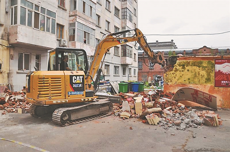 在南头道街59号院内,有个砖混院墙围起的480平方米左右的小院,燃气管道开通之前一直作为贮煤场使用,失去原有用途后,办事处用来统一存放公共垃圾桶等民用设备。中华巴洛克地区综合整治启动后,靖宇街道办事处主动发挥示范引领作用,第一个拆掉了院内贮煤场。在办事处的带动下,附近居民纷纷响应,积极配合政府推进拆违工作,6月2日当天,在道外区综合行政执法局、靖宇街道办事处的密切协作下,南头道街59号院附近的违建门斗、废弃小煤棚等共10处569平方米违建被拆除。小院敞亮了!