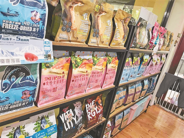 在他的店里记者看到,宠物用品按吃穿用行分门别类地摆放着,有国产的也有进口的,有大狗款也有小狗款,有基本食粮也有豪华套餐,价格也从几十元到上百元不等。