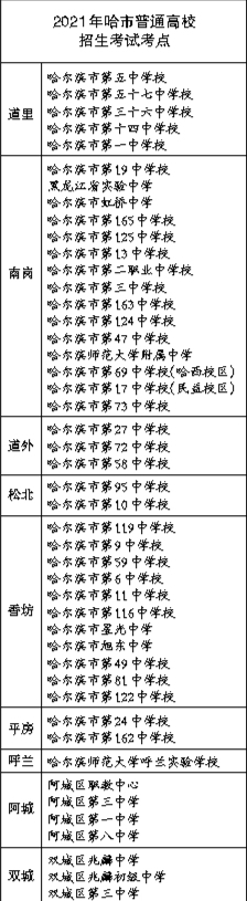 据悉,全市共设18个分考区,59个正式考点,1524个正式考场,并按防疫要求设置了备用隔离考场、考点。6月4日至6日,各区、县(市)教育局统一组织所有考生及考务人员免费做核酸检测,费用由政府承担。同时,哈市公布考点。