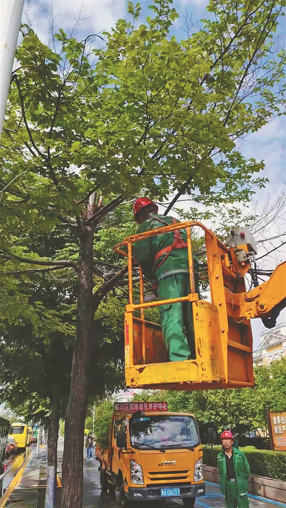 生活报讯 (记者李丹文/摄) 为全力保障高考安全,哈市南岗区园林局利用5日、6日周末时间,对位于南岗区的师大附中、虹桥中学、47中、17中、19中等15个高考考点周边的园林树木危险枝,进行了全面的安全隐患排查和清理。截至目前,冒雨修剪树木266株,摘除断挂枝、剪除枯死枝,避免折枝掉落威胁过往行人和车辆的安全。